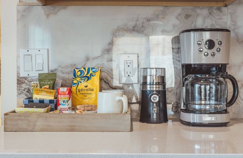 --Welcome snacks, coffee, tea, sugar, milk/cream, basic spices, oil, vinegar, parchment paper, aluminum foil, Tupperware