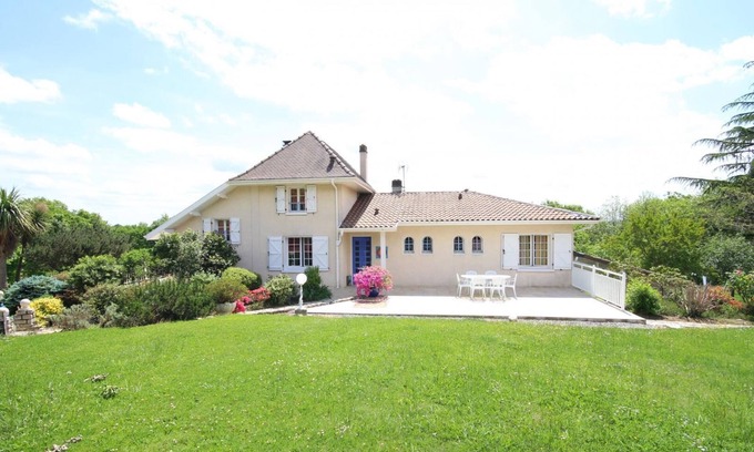 On the way to St-Jacques-De-Compostelle, this house has a magnificent enclosed park with trees and flowers of 3000 m². View of the Pyrenees. Very quiet environment. Gîte in the owner's house, presence of another small adjoining gîte. Kitchen (small electric oven, microwave, 4 gas hobs, fridge-freezer, washing machine). Living room, lounge area (TV, WIFI internet connection). 3 bedrooms (2 double beds. 2 single beds). Bathroom. Wc. Possibility to rent sheets. Baby equipment. Oil heating in addition (package 15€/day), wood stove. Large south-facing balcony with beautiful view of the mountains. Large 50m² terrace. Garden furniture. Barbecue. Independent access. Private parking with video surveillance. Hiking and mountain biking nearby. Salies de Béarn thermal baths 8 km away.