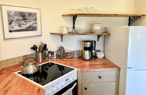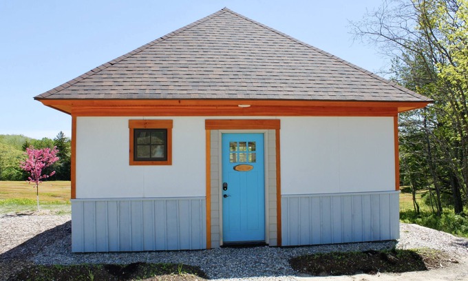 Trillium is off the main road and has two floors. A central living area with a full kitchen and bath with a washer and dryer. There is a sturdy ships ladder to the loft bedroom, which has a queen bed, dresser and hanging clothes storage. There is a new futon downstairs. The house has concrete stained floors, comfy rugs. The 8 ft sliding door goes out to the deck facing the scenic blueberry field.