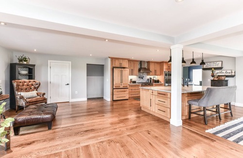 Trinity Farm Manor features an open concept living, dining and kitchen area perfect for entertaining. Modern down-to-earth luxury furniture perfect for gatherings and large screen SmartTV for your favorite movies, sports or presentation.