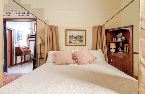 Trinity Hill Bed and Breakfast is an entire house rental in New Haven, MO, which is on the Missouri River. It is a circa 1887 one-story frame church built in the Gothic Revival style with a corner bell tower. There is one bedroom with a queen bed, and a private sleeping area in a private corner in the main room with a king canopy bed. A complimentary breakfast is available and delivered to your door. Locally roasted full pot coffee packets and teas are provided.