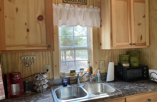 TRINITY OAK OASIS is nestled under a canopy of TX Loblolly Pine trees. Though private & set apart, it is only a short walk to all property amenities such as library, pool, hot tub and (future) pond. It includes a fully stocked kitchenette including a hot plate, microwave, coffee maker, toaster oven, waffle maker, refrig + outdoor grill.