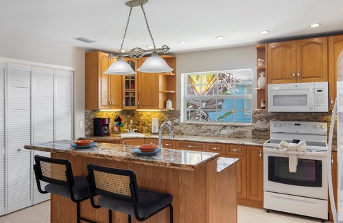 Inside, you'll find a bright, modern coastal design adorned with local Key West art, creating a true island vibe. The home offers a fully equipped kitchen and dining for six, plus a two-seat breakfast bar, smart TVs in the living room and all bedrooms for easy streaming, a king bed in the primary suite, a queen bed in one guest room, and two twin beds in the other. The updated en-suite bathroom in the primary suite adds comfort, and additional conveniences include a private downstairs renter's closet with a beverage fridge, bicycles and two kayaks (available with signed waiver), and keyless entry. This home accommodates up to 2 cars and 1 trailer. If you require additional parking, please contact us to check if extra vehicles can be accommodated.