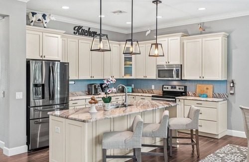 Step inside to find a spacious open layout filled with natural light and high ceilings that create a warm, breezy atmosphere. The fully equipped kitchen is a chef's dream with solid wood cabinetry, granite countertops, stainless steel appliances, a large island, and a coffee bar. It's perfect for gathering around the breakfast bar or sharing meals at the dining table overlooking the pool.