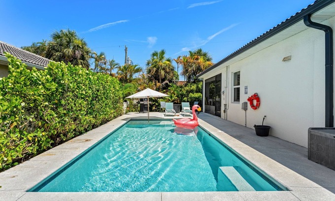 Out back, the tropical oasis awaits. Lounge by the sparkling pool or gather on the screened-in patio for sunset dinners by the gas fireplace. The fenced backyard is perfect for kids to play or for relaxing with a glass of wine on the sun loungers after a day at the beach. ☀️