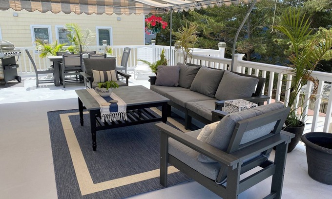 Outside deck includes new cushioned love seat, 3 oversized chairs, coffee table - grilling area of deck includes 2 lounge chairs 4 seats. Flowers and plants add to this inviting siting area - rain or shine. Cover enclosed outside shower. Beach badges. Gaming system for the kids.Surf fishing. Watch surfing in a.m. and p.m. Bay access small beach for beachcombing & boat watching.