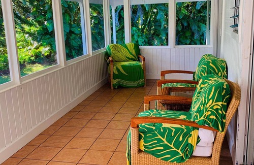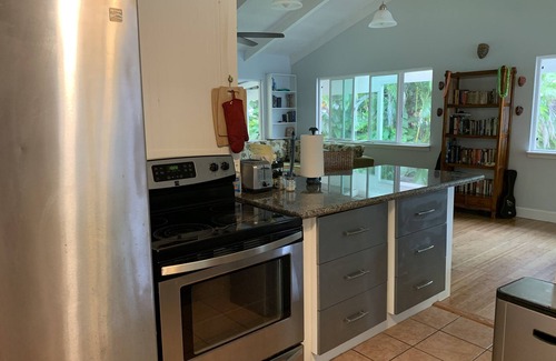 Enjoy indoor-outdoor living in our bright, open home... Relax on the lanai overlooking lush vegetation and lava outcrops, smell the fragrant Hawaiian air and listen to the waves crash in the distance. Secluded and quiet--a garden oasis far from the maddening crowd. Open windows allow for trade-wind ventilation throughout the home. Rainwater-harvest for showers/sinks (triple filtered), spring water for drinking in kitchen.