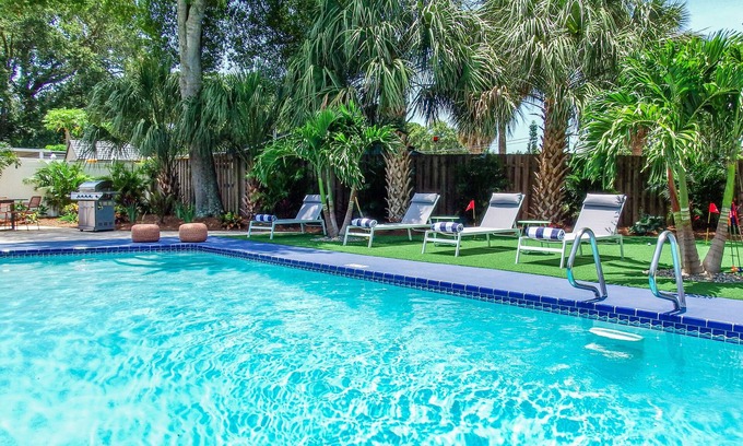 Tropical Oasis - Heated Pool - Hot Tub - Downtown and Beaches is located in Bay Crest Park. Tropical Oasis - Heated Pool - Hot Tub - Downtown and Beaches provides accommodation, featuring Private Pool, Sports/Activities, Bedding/Linens, among other amenities. This House features Private Pool, Sports/Activities, Bedding/Linens, to make your stay a comfortable one.