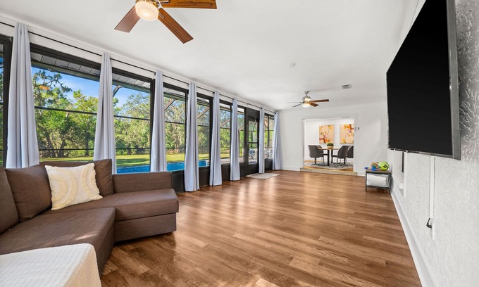Very spacious lanai has entire wall of windows, so you can enjoy beautiful view of water and nature, overlooking swimming pool. You can use this room as a playroom, office, family room or even bedroom. We have a sectional that opens to full size queen bed.