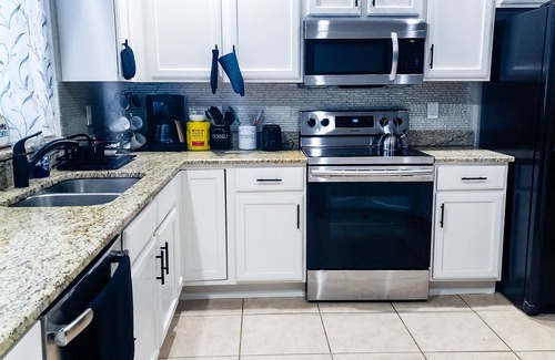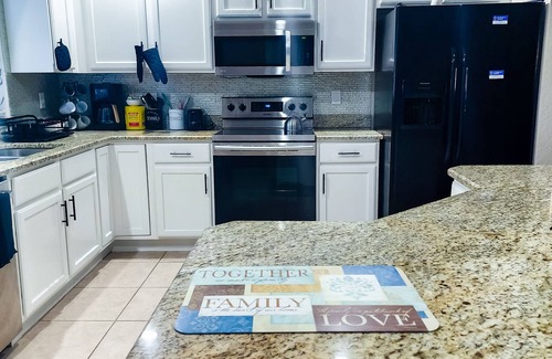 Cook and entertain with ease in the newly renovated kitchen complete with granite countertops, full-size appliances and cookware. Start your mornings with a fresh brew from the coffee maker or tea kettle. You'll have everything you need, including a refrigerator, microwave, and electric stove. French doors open to the pool area and are equipped with a child-safety alarm for added peace of mind.