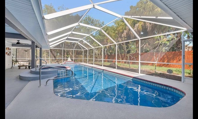 A 50ft pool in a large screened lanai. With a fire pit area out back. This house is located 3 miles to Nolomis beach and 8 miles to world famous Siesta Key. It is close to Oscar Sherer state park and downtown Sarasota and Venice