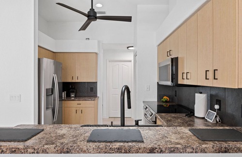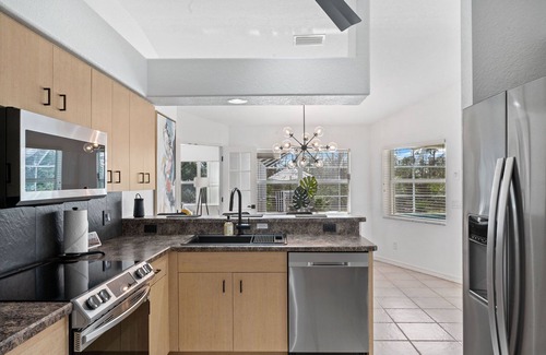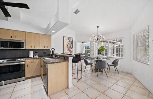 The kitchen features a breakfast bar, new stainless steel appliances, pantry and a dinette with an abundance of windows and more natural lighting overlooking the sparkling pool. Dining table comfortably for 4 people for just a family dinner to enjoy with a view of the pool. The kitchen is equipped with all you need to make a gourmet meal.
