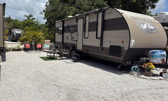 Tropical retreat in the heart of Florida Keys. Relax island-style in this private updated RV - just 30 miles from Key West and 20 from Marathon. Enjoy breezy indoor/outdoor living with a fold-down patio, 2 TVs, full kitchen, bathroom, and a stocked pantry. Nestled in a local RV park in Big Pine Key with a heated pool, shuffleboard, fish station, and coin laundry. Next to Pine Channel and 10 miles to Bahai Honda State Park. Walk to groceries, Walgreens, & local eats. No park fees—just bring your flip-flops and a smile!