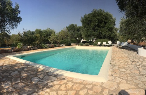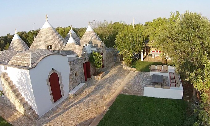 Sophisticated trullo, consisting of 5 cones and a renovated lamia, 3 bedrooms, two bathrooms, two living rooms with sofa bed, a kitchen and a magnificent outside for outdoor dining, resting on the beautiful cushions of the brick sofas and a swimming pool between the olive trees obtained in an ancient "iazzo".