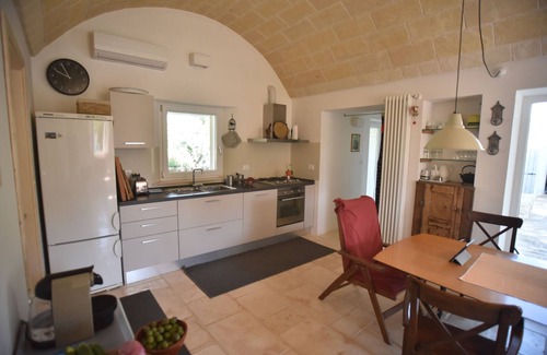 The property has three bedrooms, each with its own bathroom. There is a fourth outdoor bathroom near the pool area. One of the rooms is in the new building ("lamia"), the others are in the original complex. A trullo with a bathroom forms part of the original structure, but has a separate entrance. The lamia also houses the open plan kitchen diner and in an alcove is the living room, furnished with a sofa and TV. The sofa can be transformed into a bed, to provide accommodation to two occasional guests. The new building is equipped with air conditioning; the trulli - which are extremely cool - have fans. At the back of the trullo a shaded patio is furnished with a table and chairs with a sink and a barbecue nearby. Another stone table is at the front of the trullo.