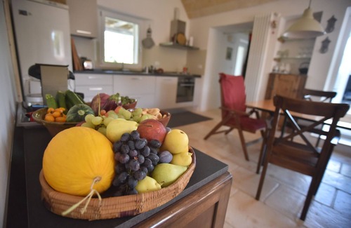 The structure includes three bedrooms, each with a bathroom. A fourth external bathroom serves the swimming pool area. One of the rooms is located in the extension, the others in the original complex. A trullo with bathroom is an integral part of the structure, but has an independent entrance. The new lamias also house the dining room with open kitchen and an alcove furnished with sofa and TV. The sofa can be converted into a bed, to accommodate two occasional guests. The new area is equipped with air conditioning, in the trulli - already very fresh by nature - floor fans are available. On the back, a shaded patio is furnished with table and seats and is organized with sink and worktop; a barbecue is available in the immediate vicinity. Another brick table is placed in the front area. The swimming pool measures 13 X 3 m, its depth degrades from 60 to 160 cm.