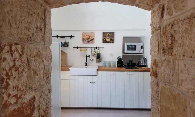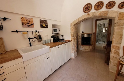 The entrance door leads into the central cone of the trullo used as a living room, where there is a rustic table with a bench and straw chairs, as well as a comfortable sofa that can be transformed into an additional bed for max 2 guests if necessary. A flat-screen TV with satellite channels completes the room. Crossing a stone archway you pass into the large kitchen equipped with appliances (fridge / freezer, dishwasher, induction hob, microwave oven, coffee machine) and dishes / pots.
