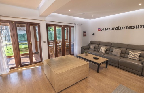 On the ground floor you will find a room to wash clothes and a toilet. A spacious and cozy living-dining room with double-sided wood-burning fireplace and kitchen. Projector and home cinema to enjoy cinema in a big way. A professional table football. Winter porch with built-in barbecue and a fun garden with shower and trampoline. In addition, the house has underfloor heating with individual thermostats in each room and an enveloping background music. On the first floor there is a bathroom, four bedrooms (two can be connected) and a study and/or play area that has another extra double bed. The hallway has smart lights. The second floor has a large covered terrace. King size bed and extra bed (family suite), television. Dressing room, bathroom, toilet and sauna. It is a very quiet town, with a playground. Very close to the Eugui reservoir, Zubiri and 20 minutes from Pamplona city. Perfect place for trekking through the mountains, on foot or by bike, going for mushrooms, excursions to Roncesvalles, Quinto Real, San Sebastián, France, the Pyrenees... If you like fishing there are trout rivers. Pets Allowed.