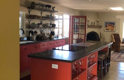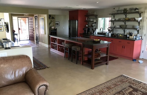 There are four bedrooms and three bathrooms. The primary suite has a king size bed and a large attached bathroom. The other two bedrooms in the main house have queen size beds and are just across the hallway from a full bathroom. A private, separate casita off the back patio has a king size bed, walk in closet and full bathroom. Two living areas provide lots of comfy seating for reading a book, watching a movie or playing games. The kitchen is fully stocked and ready for creating delicious meals. A screened-in patio lounge area is perfect for enjoying warm evening breezes and mountain views.