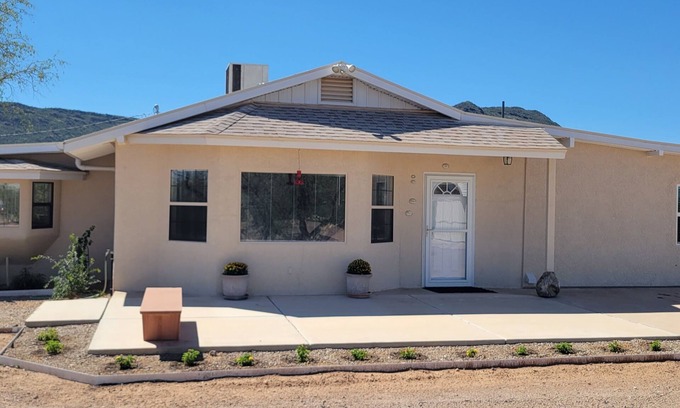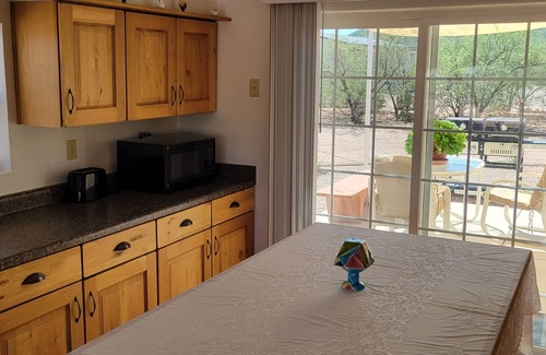 newly renovated inside and out, spacious great room, fabulous views from 3 large bay windows, peaceful and very quiet. Enjoy the wildlife around the property, quail, dove, hummingbirds, roadrunners, rabbits and much more. Automatic gates at the entrance to the rental. A key fob is in the rental for your use to open and close the automatic gates from your vehicle while you're enjoying your stay. Scenic views, come see the gorilla on Black Mountain. 2 miles to convenient shopping, golf and casinos. Welcome Home!