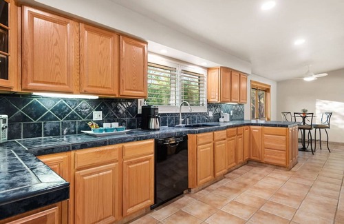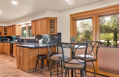 As you step inside, you'll discover an array of modern amenities designed to elevate your stay. The house features luxurious remodeled bathrooms with high-end finishes, two plush Casper King beds for restful nights, and additional accommodations for up to six adults. Indulge in relaxation by the original non-heated pool or soak under the stars in the inviting hot tub. The covered porch, adorned with vibrant lighting, provides a beautiful setting for evening gatherings as you and your guests savor stunning Tucson sunsets. With dedicated workspaces, high-speed internet, and a fully stocked kitchen, you have everything you need to make your wedding experience seamless and enjoyable.