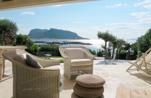 "Tugurio", 3-room house 70 m2. Bright, comfortable and tasteful furnishings: living room with dining table and satellite TV. Exit to the garden, to the terrace. 1 double bedroom with shower/WC. 1 room with 1 bed and 1 x 2 bunk beds. Kitchen (oven, dishwasher, 4 induction hot plates, toaster, microwave, electric coffee machine). Exit to the terrace. Shower/bidet/WC. Electric heating, air-conditioning (extra). Terrace partly roofed, garden, lawn. Terrace furniture, deck chairs (2). Marvellous view of the sea and Tavolara. Facilities: washing machine, iron, children's high chair, baby cot (extra), hair dryer. Internet (WiFi, free). Parking (roofed). Maximum 1 pet/ dog allowed. Direct access to the water from the garden. IT090083B4000E2141