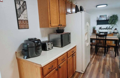 The home features a cozy layout with two bedrooms and one full bathroom. The living room offers comfortable seating for up to four and also opens to a bar area, perfect for enjoying a beverage after a day of exploring! The kitchen is well equipped and has a dining area as well. The master bedroom has a queen-sized bed, and the second bedroom has a full-sized bed. The exterior of the home offers a large and lighted back deck with outdoor furniture and a grill. Guests will have a backyard to enjoy and ample parking.