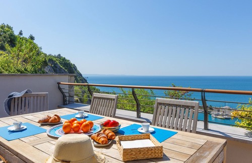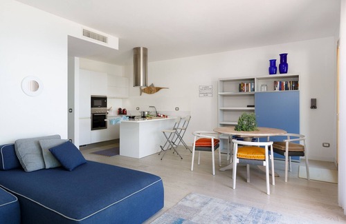 Overlooking the endless blue, this splendid sea view apartment welcomes you with natural light that filters broadly through the windows and reflects in the fresh tones of a meticulously detailed nautical-style decor.