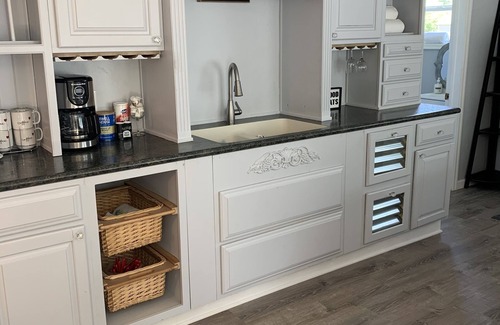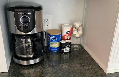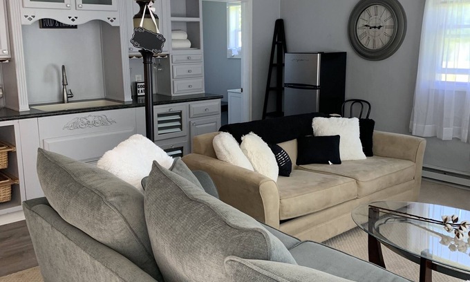 Cute and compact space with new furnishings, a separate king bedroom and a pull out couch in the living room. Flat screen TVs in both sleeping areas and a kitchenette with a sink, Frig and microwave/cooking small oven.