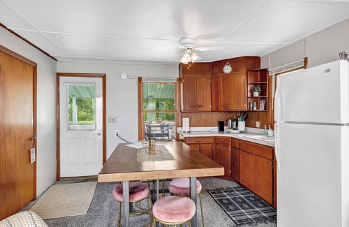 The cottage has two bedrooms (one queen bedroom overlooking the bay and one bedroom with a full-over-full bunk and twin trundle). The main living area is open concept with a large sliding door which opens to the beachfront. The living room has a new pull out couch for extra sleeping space. Also there is a charming, fully stocked kitchenette, & full bathroom. The kitchen hosts counter height table for extended meal preparation and seating for six.