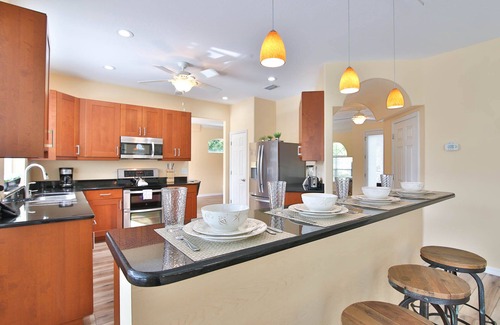 The kitchen is fully loaded, with everything you need to prepare meals, snacks, and master the art of blending a frozen cocktail! The dining room and kitchen island have plenty of seating for the whole family to enjoy.