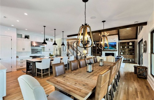 This exquisite home is located in a private, gated community near the north end of Lake Keowee. The great room been carefully crafted with a wooden beams and tongue and grove vaulted ceilings. The stunning and massive dining table seats 12 and offers a great view of the lake. Windows and sliding glass doors on each level open up to beautiful inviting porches, each with a wood burning fireplace and comfortable seating.