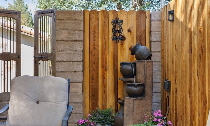 Perfect for a romantic vacation in wine country, this delightful 1-bedroom, 1 bath, petite-villa, located on 20 picturesque acres of a working vineyard, winery and tasting room is just what you are looking for. This adorable Tuscan themed petite-villa offers a large bedroom with queen bed, large closet, dresser, 2 nightstands, side chair and table, suitcase stands and iron and ironing board. Off the bedroom is an adjoining private patio complete with comfy furniture, lovely plantings and a relaxing water feature.