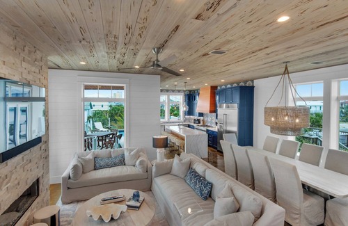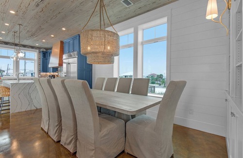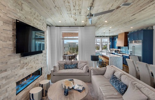 Tuscan Sun is an award-worthy, luxury retreat located at 301 Ariola Drive in the heart of Pensacola Beach. With six bedrooms, six full bathrooms, and a half bath across three levels, this expansive beach home is ideal for multi-generational families, large groups, or event gatherings. The main living level features a Gulf-facing great room, chef’s kitchen, and dining space that flow seamlessly to the private pool deck, offering endless views and indoor-outdoor living. The primary king suite is also located on this level for convenient access.
