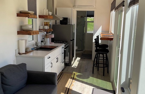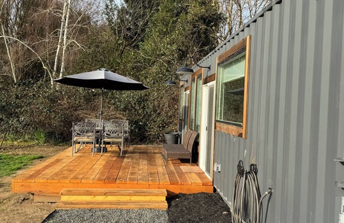 Along the Stanislaus River, this charming container home offers the perfect blend of modern comfort, style, and adventure, all with safety as a top priority. The Villa features breathtaking views, direct river access, and a modern design with hardwood floors throughout, a kitchen with quartz countertops, and stainless steel appliances. Large windows flood the space with natural light, while pull-down blinds ensure privacy. Abundant storage includes a spacious built-in closet and extra space under the bed.