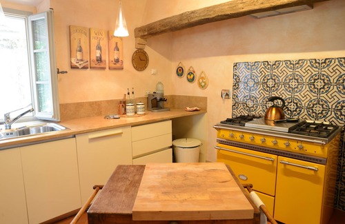 For those who want to improve their culinary skills there is a professional kitchen (Lacanche) and outside a quaint stone barbecue. The large travertine table under the 'pergola' of wisteria is ideal for those who want eat outdoors
