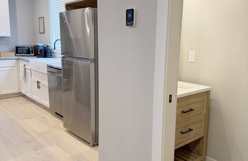 - **First Floor**: Step through the door to be met with tasteful design, featuring hardwood floors and warm accents. A cozy bedroom with a queen-sized bed ensures restful sleep. It comes complete with a closet, ceiling fan, and access to a full bath equipped with toiletries.