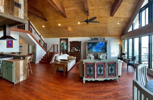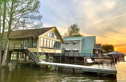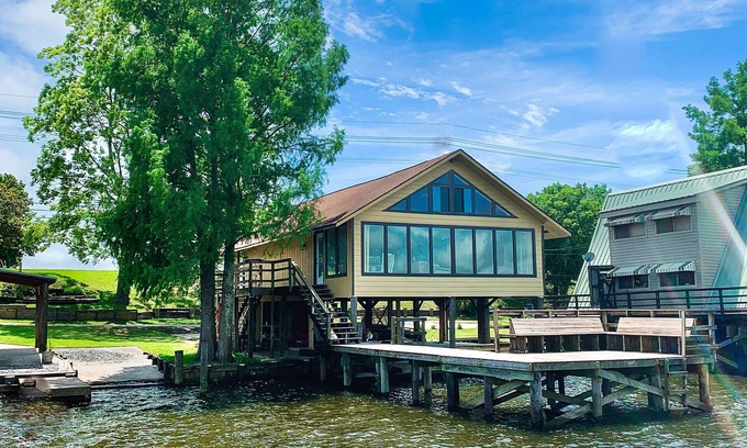 This Lakehouse is literally over the water. It has an unforgettable panoramic view overlooking the lake! The kitchen is built into the living room so you can prepare food and enjoy the view at the same time. The custom kitchen is adorned with 150+-year-old reclaimed cypress wood. All kitchen appliances are NEW and stainless steel. Including a high-end gas Z-Line stove and oven. There is a custom bar top that wraps around the kitchen as well. Great for serving food and enjoying a beverage. The entertainment center includes a 75 inch LG smart TV. It can easily be enjoyed from anywhere in the living room including the kitchen. 5 XLarge cypress beams going across the ceiling give it a feeling of south LA rustic charm. All of the bedrooms are custom built with individual accents in each. This place is ultra comfortable and has a very relaxing atmosphere. Find out more about our pontoon boat rentals at www.rentalsonfalseriver.com
