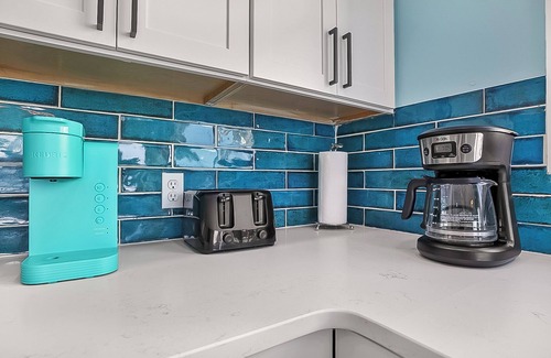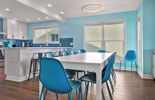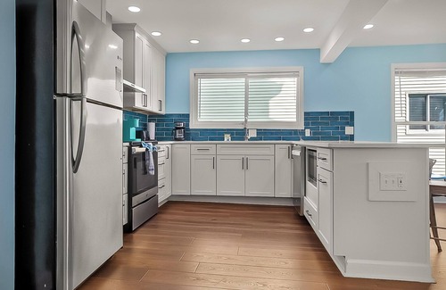 Kitchens: The property boasts two fully equipped, renovated kitchens with sleek cabinetry, new countertops, under-counter microwaves, stainless steel appliances, and a striking teal subway tile backsplash. Preparing meals for a large group has never been easier or more enjoyable.