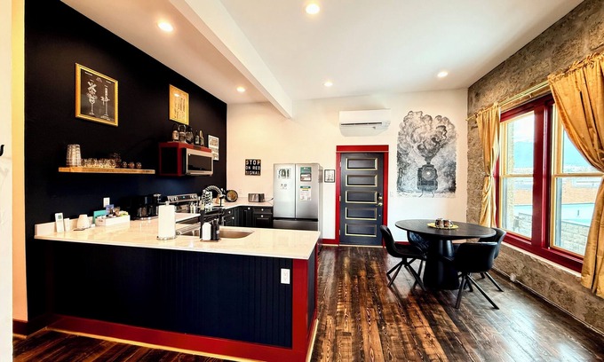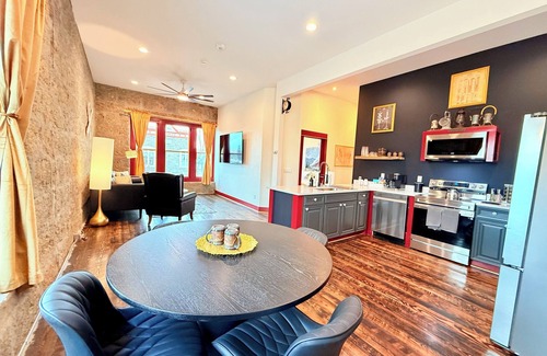 Stay at "Twin Peaks", a luxury 2nd FL condo in Enterprise's historic Litch Hotel, blending modern comfort, vintage charm and a fishing theme. It features 11 ft ceilings, original exposed stone wall in 1 bedroom, real wood floors, tiled bathroom, quartz countertops, locally handmade tableware, and AC.
