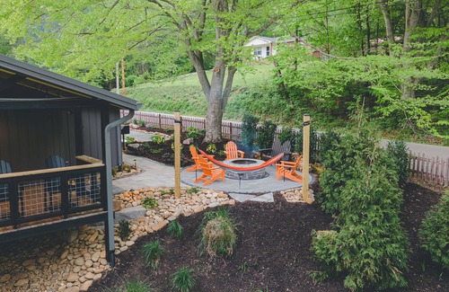 COVERED DECK - Bar height deck chairs and wide railing for relaxing and watching the disc golf game (bring your own discs). Conveniently located to interact with your friends who are hanging out at the fire pit or in the dining room
