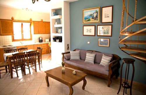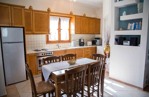 Entering the villas, a spacious open-plan living-room furnished traditionally including 2 Cretan day-bed sofas (accommodating 2 guests), a dining table & chairs and a fully fitted kitchen and a bathroom with shower and washing machine is offered.