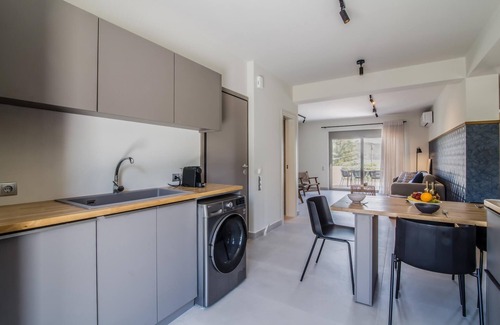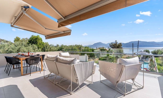 Luxury two bedroom apartment with spectacular views of the blue Ionian Sea! It has an open plan area with a fully equipped kitchen and living room! There is also a washing machine and dishwasher in the kitchen area! The sofa in the living room can become a comfortable double bed. It still has two bedrooms with large side beds, air conditioning and TV! There is a large bathroom and a wc. The magnificent view from its large veranda will surely enchant you!