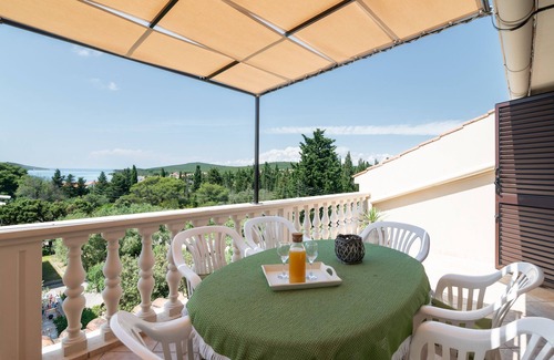Apartment can accommodate 5 guests. Beds are situated in 2 sleeping rooms, but also in the living room, within 49m2. Guests can use a private terrace to enjoy the warm summer evenings. The apartment offers the sea view. Food can be prepared using barbecue which is shared with other guests too.