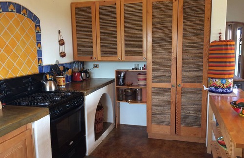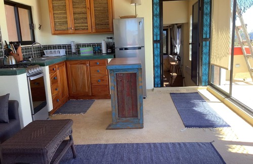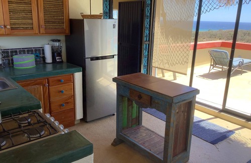 Casa Breezes (Brisas) is a self-catered and self-operated two bedroom house located in the breathtaking beauty of the East Cape of Baja. The main floor features a large living room, kitchen, bedroom, bathroom, and covered and uncovered decks. The large second bedroom is on the 2nd floor with its own small kitchen, sitting area, bathroom, and sun deck. So the house it’s ideal for two couples (each floor is not available separately, you get the whole house). The house is accessible by car in about 1 ½ hours from San Jose Del Cabo and the Cabo Airport. It is situated in a small enclave of Canadians and Americans in the secure community of Castillo de Arena on a hillside overlooking fantastic sand dunes and the Sea of Cortez. The beach is a 12 minute walk or 3 minute drive away. When we are there we swim most days just off the large sand dune. Pickle ball and bocce ball courts close by. The community is 8 km south of Los Frailes, the start of Cabo Pulmo national park and a wonderful snorkel spot where you can buy fish directly from the fishermen on the beach. We are 16 km south of the town of Cabo Pulmo, a world-famous coral reef diving site where tours are available and 1hr 20 min from the Los Barriles kite surfing area. The home is about 1,900 square feet; the first bedroom is on the main floor, and the second is upstairs accessed by outdoor stairs. Both bedrooms have queen beds. The house sleeps up to 5 with an air-bed available for the kids or extra guests. One or two well- behaved dogs are welcome. Both bathrooms have showers and there are laundry facilities on the main floor. There is free internet, a BBQ (grill), and fully equipped kitchens. In the living-room, watch your netflix or listen to your favorite music. There is a BBQ area, and several palm roof shaded patios to lounge, gather for meals, and enjoy the breathtaking view. We often see whales frolicking off-shore and colourful sunsets over the mountains. The community is off-the-grid and operates on solar energy and propane. You won’t tell the difference though, except that hair dryers and toasters are not permitted as they drain the solar energy batteries. Our caretaker (English speaking) lives nearby and is available during your stay. Unlike some vacation rentals, we spend several months a year here so the kitchens are really fully equipped and the house is clean and well maintained. We have a UV purifying system for the water as well as bottled water available. All dishes, cooking utensils, bedding, towels, paper products, and cleaning supplies are provided. You will need to bring your own food.