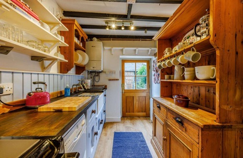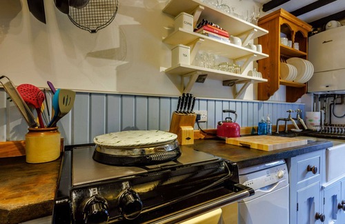 Exposed beams, garden access, electric Aga with hob, fridge/freezer, microwave, dishwasher, kettle, toaster and cafetiere