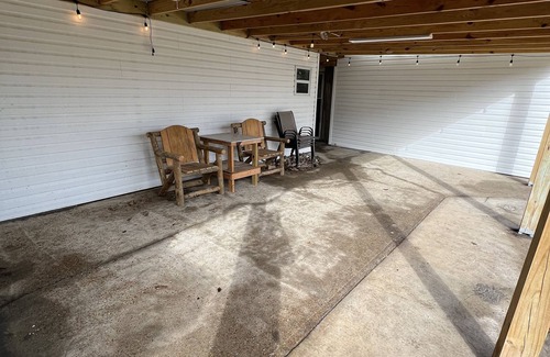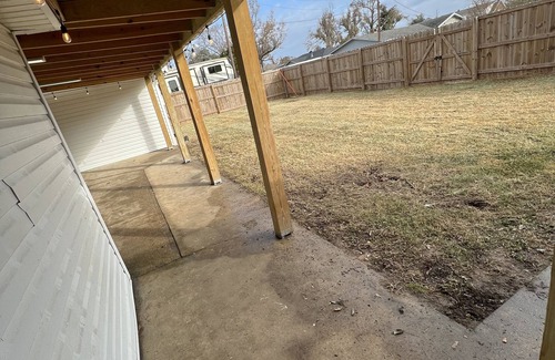 Backyard with privacy fence and overhead awning , perfect for pets and hanging out