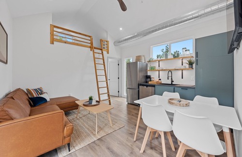 Spacious Accommodations: The tiny home features a two-bedroom layout with lofted ceilings and additional sleeping arrangements, comfortably accommodating friends and family visiting for your wedding festivities.