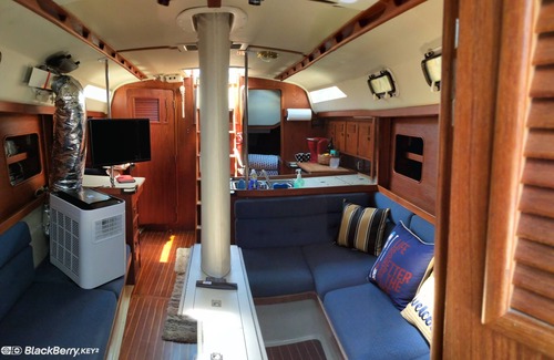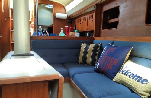 The front bedroom features a custom queen sized mattress v-berth while the other bed is more like a single or small double. There's a kitchen and main lounge area. It comes with a fridge and stove for your use. There's a full bath onboard, but it's the typical boat shower. There's a bath-house in the marina if you're more comfortable showering there or using it's toilets for non-number ones! We've stocked it with bedding and sheets, basic utensils, coffee, and a few sodas to help make you stay more enjoyable.