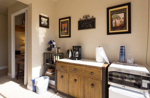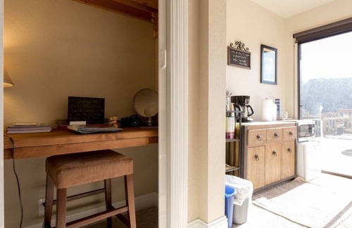 Constant sunshine, pastoral ambiance, fascinating wildlife, on a three acre nature-scaped mountainside parcel and forever views that inspire and rejuvenate the soul. There is a large fridge with filtered water and ice, sink, microwave, tea/coffee and self-serve oatmeal/cereal bars but no full kitchen or stove/oven cooking facilities.